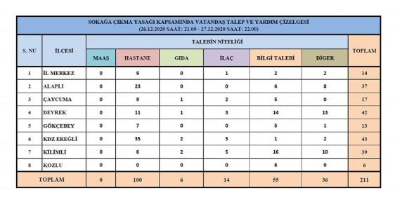 26 Aralık Cuma günü saat 21.00’den 27 Aralık Pazar günü saat 22.00’ye kadar devam eden Sokağa Çıkma Yasağı çerçevesinde vatandaşların 100'ü hastane, 6'sı gıda, 14'ü ilaç, 55'i bilgi talebi ve 36 çeşitli konular olmak üzere toplam 211 talebe karşılık verildi.
