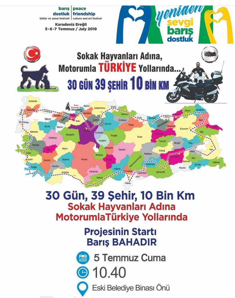 Ereğlili motor tutkunu Barış Bahadır, sokak hayvanlarına dikkat çekebilmek için, motosikletle Karadeniz Ereğli’den çıkacağı Türkiye Turu kapsamında 39 şehri kapsayan 10 bin kilometre yol yapacak. Turun 30 gün sürmesi bekleniyor.