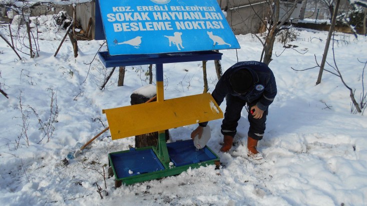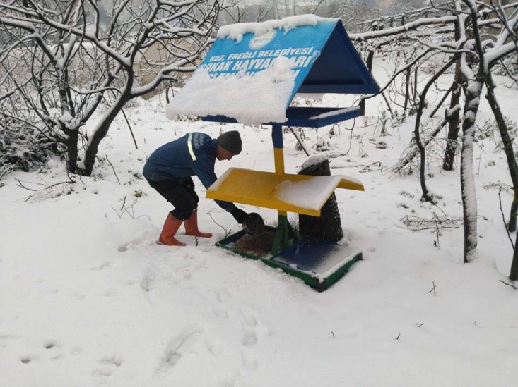 Kdz.Ereğli Veteriner İşleri Müdürü Erdal Terzi, soğuk havalarda dışarıda yaşamak için mücadele eden sokak hayvanlarının bir yandan da açlıkla mücadele ettiklerini belirterek; "Hava sıcaklıklarının eksi derecelerde seyretmesi en çok da sokak hayvanlarını etkiliyor. Yiyecek bulamayan hayvanlar, donma tehlikesiyle karşı karşıya kalıyorlar. Biz Ereğli'de sokak hayvanlarının bu duruma düşmemesi için günlük ihtiyaçlarını karşılıyoruz. 14 ayrı korunaklı bölgede oluşturduğumuz besleme noktaları 3 ayrı kedi beslenme evinde her gün mama, yem ve su ihtiyaçlarını karşılıyoruz. Ayrıca sahil bandında deniz kuşlarına ekmek, şehir merkezinde yaşayan kuşlara buğday, yine kedi ve köpekler için kuru mamalar koyuyoruz" dedi.