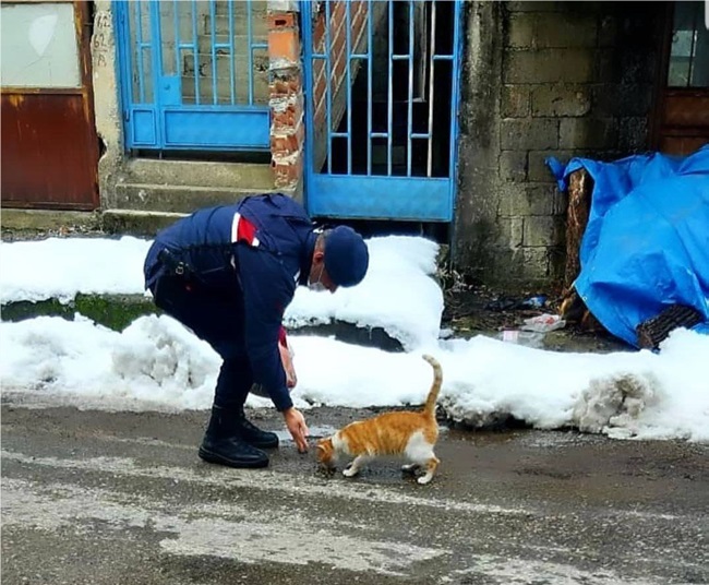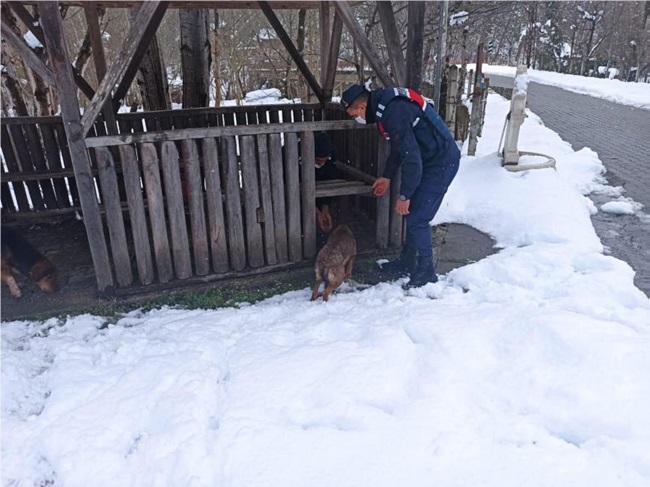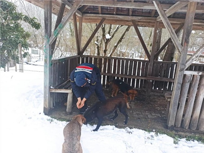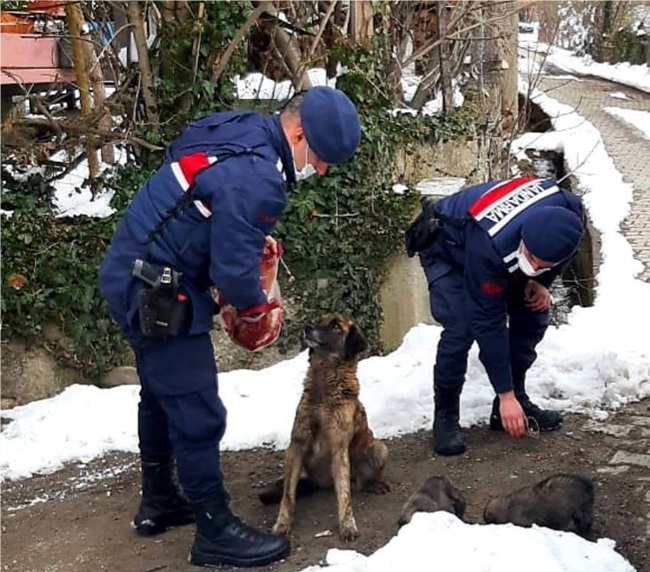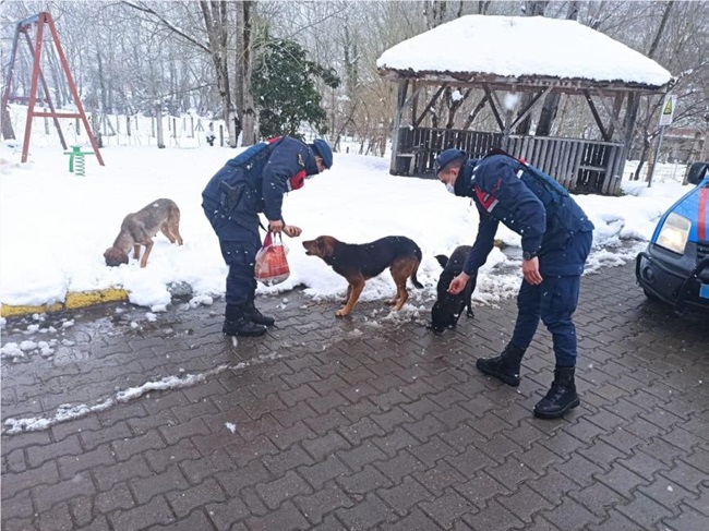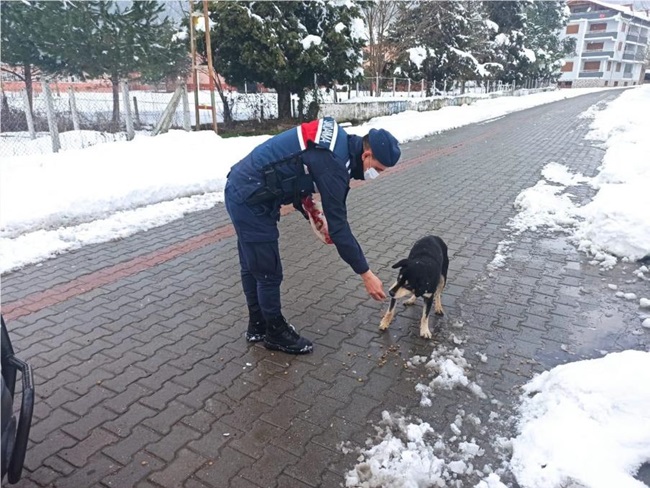 “ Zonguldak İl Jandarma Komutanlığına bağlı ekipler, 20.01.2022 günü icra edilen önleyici kolluk devriyesi esnasında, Devrek ilçesi Eğerci köyünde başıboş bir şekilde arazide bulunan ve kış şartları nedeniyle yiyecek bulmakta zorlanan sokak hayvanlarının yiyecek ihtiyaçları karşılanmıştır” denildi.