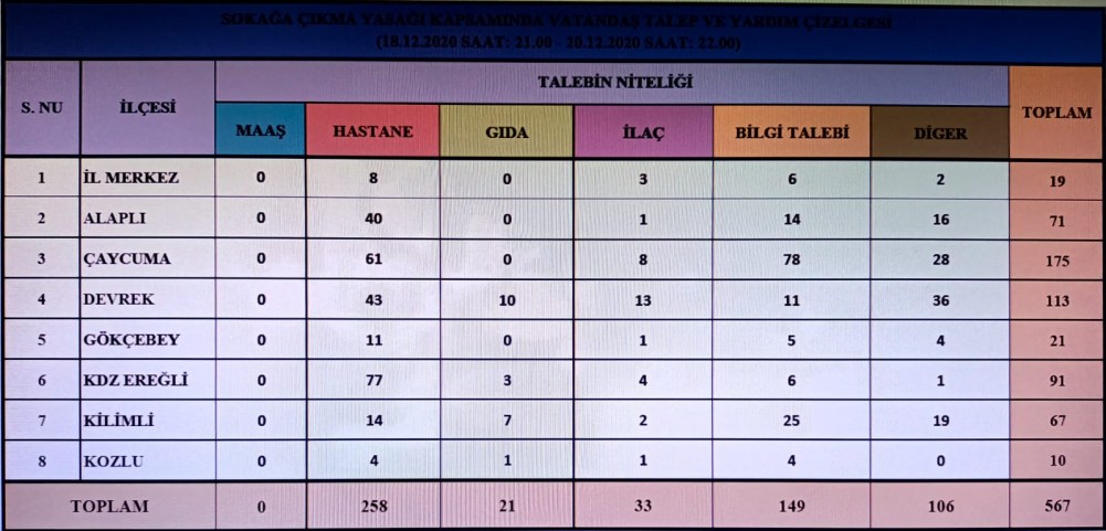 18 Aralık Cuma günü saat 21.00 ila 20 Aralık Pazar günü saat 22.00’ye kadar sokağa çıkma yasağı kapsamında vatandaşlar, hastane 258, gıda 21, ilaç 33, bilgi talebi 149, diğer 106 olmak üzere toplam 567 talep ve yardımda bulundular. Maaş talebinde ise bulunulmadı.