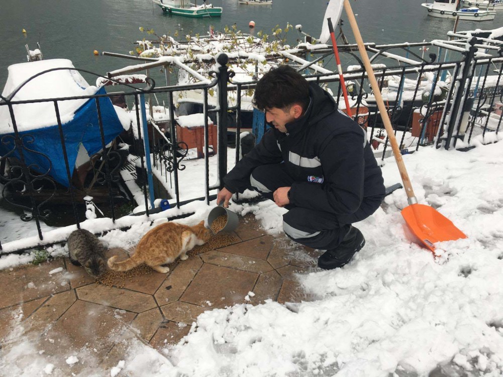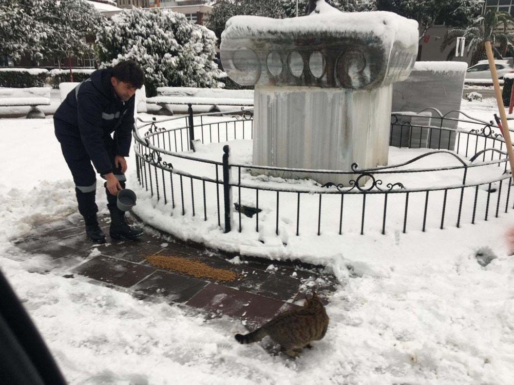 Kdz. Ereğli'de yeni yılın ilk günü kar yağışı ve soğuk hava etkisini sürdürürken Belediye Veteriner İşleri Müdürlüğü sokaktaki canları unutmadı.