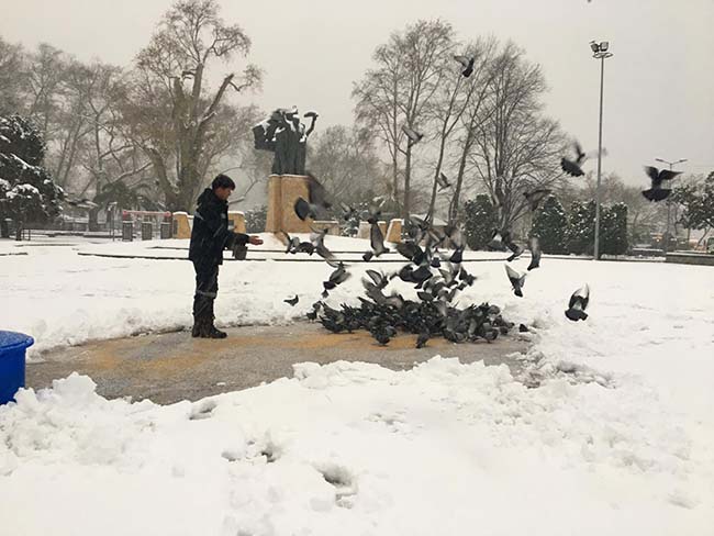 Kanatlı hayvanlar için Atatürk Anıtı ve sahil bölgesine yem bırakıldı, barakaları kardan temizlendi.