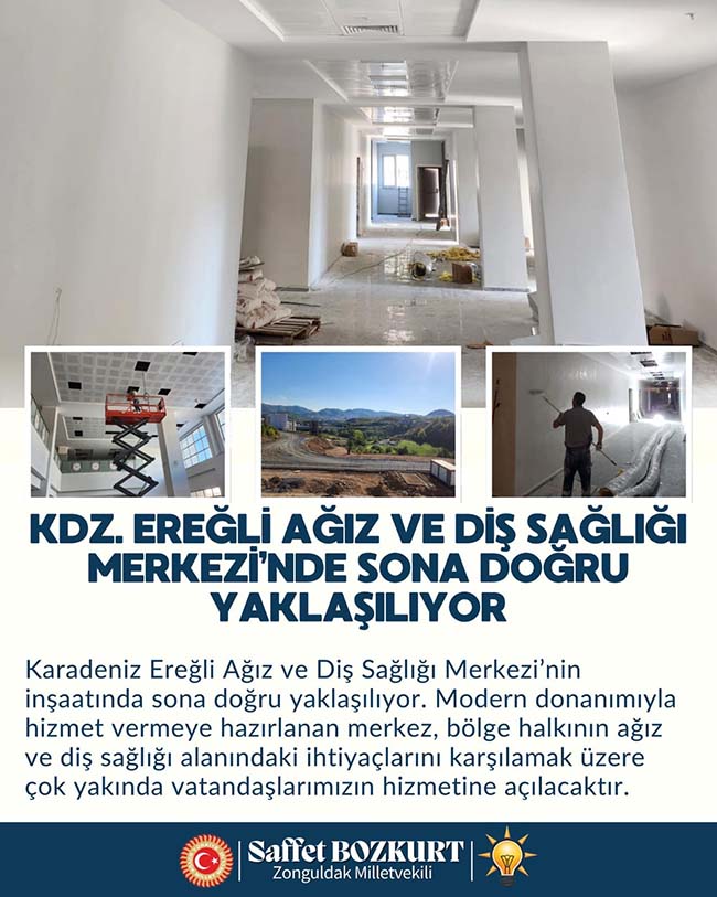 Konu ile ilgili olarak açıklamada bulunan AK Parti Zonguldak Milletvekili Saffet Bozkurt “Ereğli Ağız ve Diş Sağlığı Merkezi’nde sona doğru yaklaşılıyor. Karadeniz Ereğli Ağız ve Diş Sağlığı Merkezi’nin inşaatında sona doğru yaklaşılıyor. Modern donanımıyla hizmet vermeye hazırlanan merkez, bölge halkının ağız ve diş sağlığı alanındaki ihtiyaçlarını karşılamak üzere çok yakında vatandaşlarımızın hizmetine açılacaktır” ifadelerine yer verdi.