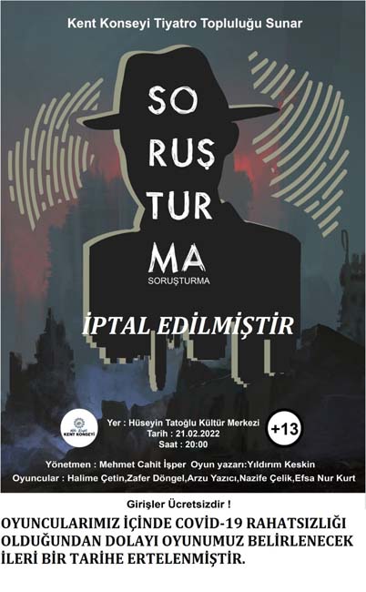 Kdz. Ereğli Kent Konseyi Tiyatro Topluluğu tarafından bugün, (21 Şubat Pazartesi) sahnelenecek olan “Soruşturma” adlı oyun ileri bir tarihe ertelendi.