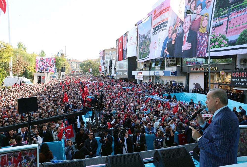 Bu çerçevede 45 ilde 80 tarihi meydanın yeniden canlandırıldığını söyleyen Erdoğan," Ankara'da da başkentimizin ilk toplu konut projesi Saraçoğlu Mahallesi'ni yeniden düzenleyerek şehrimize armağan ediyoruz. Hergele Meydanı'nda Hacı Bayram-ı Veli Hazretlerinin arşınladığı yolları temizliyoruz. Millet Bahçeleri projeleri ile her yaştan insanımıza yeni nefes alanları hayat alanları açıyoruz. Dikkat ederseniz bunların hepsi şehircilik alanlarında yaptığımız çalışmalar. Eğitimde, sporda, sosyal desteklerde durum aynı. Sağlıkta, ulaştırmada, enerjide, sanayide, tarımda durum aynı. Bir de bu CHP'ye sorun siz ne yaptınız? Ziya Paşa diyor ki; Eşek ölür semeri, insan ölür kalır eseri. Biz eserlerimizle konuşuyoruz. Güvenlikte, savunmada, adalette durum aynı. İHA'larımız var mı? SİHA'larımız var mı? Akıncılarımız var mı? Evvel Allah daha neler olacak neler.