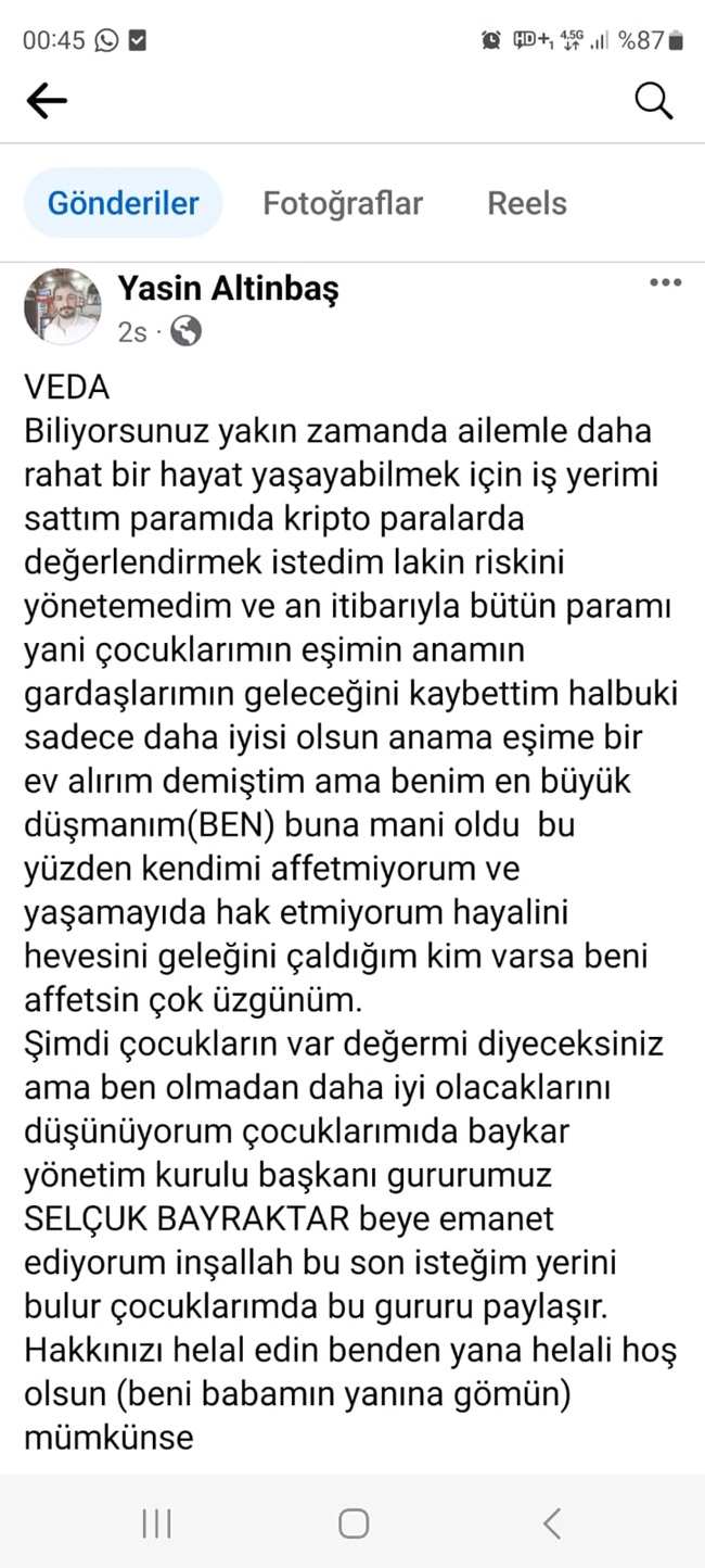 Sosyal medyasından paylaşımda bulunan ve ölmesi durumunda çocuklarının Selçuk Bayraktar'a emanet edilmesini istediği görüldü. İşte Yasin A.'ın yazdığı VEDA yazısı...
