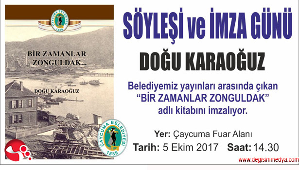 Çaycuma Belediyesinin bir kültür hizmeti olarak yayımladığı "Bir Zamanlar Zonguldak" adlı kitabın tanıtımı, yazarı Doğu Karaoğuz'un da katılımıyla, 5 Ekim Perşembe günü (bugün), saat 14.30'de, 1. Batı Karadeniz Dekorasyon ve Mobilya Fuarı'nda yapılacak. Karaoğuz, fuar etkinlik alanında kitabı üzerine bir söyleşi yaptıktan sonra, katılımcılara, Çaycuma Belediyesinin standında kitaplarını imzalayacak.
