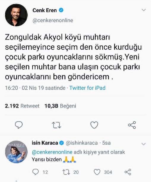 Şarkıcı Cenk Eren ve Işın Karaca, Zonguldak'ta seçimi kazanamadığı için yaptırdığı çocuk parkını yıkan muhtar adayına tepki göstermişti. Işın Karaca'nın da destek verdiği Cenk Eren, parkın oyuncaklarını bizzat kendisi satın alarak yaptıracağını söylemişti. Cenk Eren'in sosyal üzerinden çağrıda bulunmasından kısa bir süre Gülüç Belediyesi yıkılan yere yeni park yapmıştı. Cenk Eren verdiği sözü tutmak için köy muhtarı Rıdvan Onay ile bağlantıya geçip, köyün başka bir yerine çocuklar için park yapmak isteğini iletti.