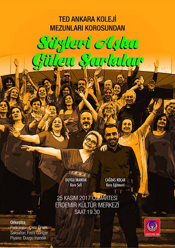 TED Kdz. Ereğli Koleji sosyal ve kültürel etkinliklerine devam ediyor. TED Ankara Koleji Mezunları Korosu 25 Kasım 2017 Cumartesi günü Erdemir Kültür Merkezi'nde saat 19:30'da "Sözleri Aşka Gülen Şarkılar" konseriyle kulakların pasını silecek.