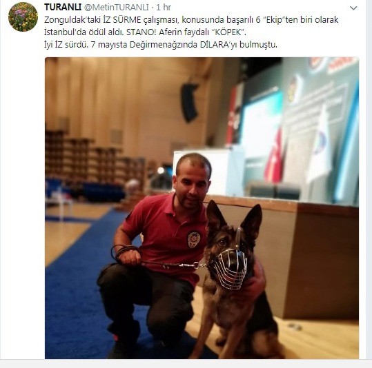 İl Emniyet Müdürü Turanlı, Twitter hesabından yaptığı açıklamada "STANO...! Aferin faydalı köpek iyi iz sürdü, 7 Mayıs'ta Değirmenağzı'nda DİLARA'yı adlı çocuğu bulmuştu" dedi.