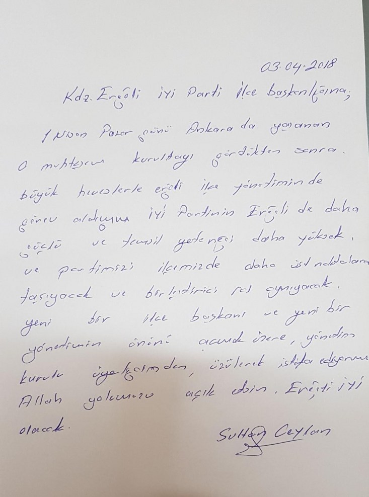 Ereğli İyi Parti'de istifa depremler devam ediyor. Partinin yönetim kurulu üyesi olan Sultan Ceylan yazdığı mektup ile partinin yönetim kurulu üyeliğinden istifasını duyurdu. Ceylan yazdığı istifa mektubun da " 1 Nisan Pazar günü Ankara'da yaşanan o muhteşem kurultayı gördükten sonra Ereğli ilçe yönetiminde görev aldığım İyi Parti'nin daha güçlü temsil yeteneği daha yüksek ve partimizi ilçemizde daha üst noktalara taşıyacak ve birleştirici rol oynayacak yeni bir ilçe başkanı ve yeni bir yönetimin önünü açmak üzere yönetim kurulu üyeliğimden üzülerek istifa ediyorum. Allah yolumuzu açık etsin. Ereğli iyi olacak" dedi.