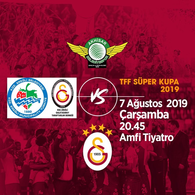 2019-2020 Sezonu başlangıcında 2018-2019 sezonundaki bütün kupaları almanın morali ile girerek rakiplerine üstünlük kurmak isteyecek İmparator Fatih TERİM ve talebeleri AKHİSAR Spor ile Süper Kupa finalinde karşılaşıyor. Kdz. Ereğli Belediyesinin katkılarıyla sahil bandında bulunan amfi tiyatroda taraftarlarımızla bir araya gelerek, yan yana omuz omuza sarı-kırmızı renklerle donatarak dev ekranda maç keyfini yaşayacağız. Formanla, atkınla amfi tiyatroda buluşuyoruz.