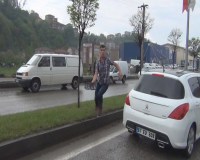 Karadeniz Ereğli'de direksiyon hakimiyetini kaybeden sürücü elektrik direğine çarptı. Kazadan yara almadan kurtulan sürücü kendisine kaza yaptırdığını iddia eden bir sürücüye, daha sonra da görüntü alan muhabire saldırdı.
