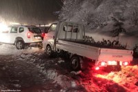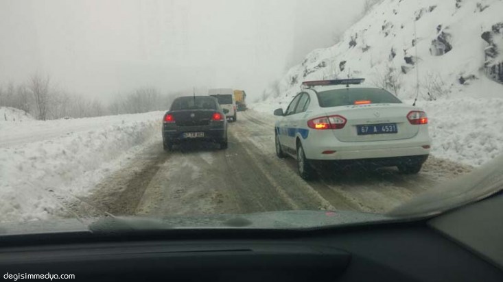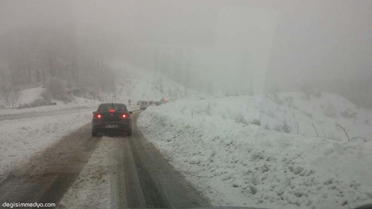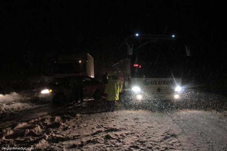 Zonguldak-İstanbul karayolunda gece saatlerinde araçlar yolda kaldı. Kapanan yolda durmak zorunda kalan otobüsü muavinler ve yolcular battaniye ve zincirlerle kurtarmaya çalıştı.