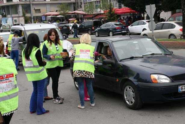 Trafik polisi tarafından durdurulan araç sürücüleri ve bölgedeki yayalara "Yaşama yol ver" ifadesi ve ambulansların geçiş üstünlüğüne vurgu yapan broşürler dağıtıldı.