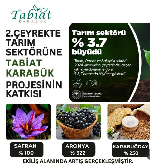 Karabük Tarım ve Orman Müdürü Çetin Ayvalık, doğal zenginlikleri ön plana çıkaran, çevreye duyarlı, üretim amaçlı, vizyon bir proje olan Tabiat Karabük Projesi ile Karabük ve İlçelerinde &100 Safran, &322 Aronya, &250 Karabuğday Ekili alanda artış yaşandığını belirtti.