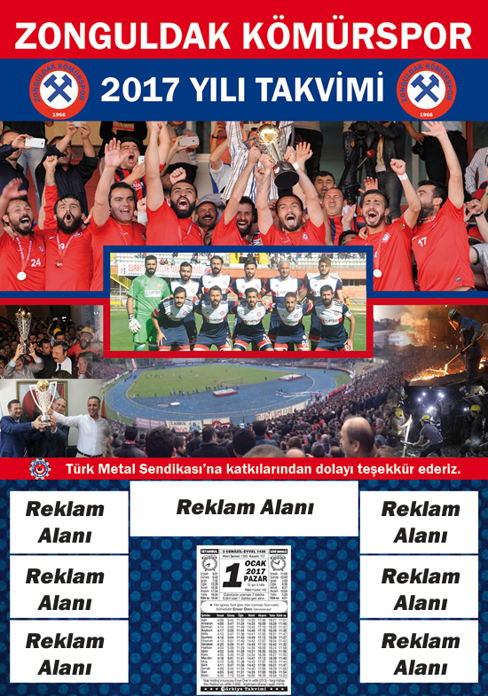 Zonguldak Kömürspor yönetimi, kulübün ekonomisine katkı sağlamak amacıyla 2 yıldır yapılan Zonguldakspor takvimlerinin hazırlıklarına başladı. Bu doğrultuda çalışmalarını sürdüren kırmızı-lacivertli yönetim, kulübe gelir getirmesi ve taraftarıyla bütünleşmek amacıyla takvim projesini hayata geçirecek. 10 bin adet takvim bastırmayı planlayarak mali sıkıntının bir nebze önüne geçmek isteyen yönetim, takvime alınacak reklamla en azından maliyetlerin karşılanmasını amaçlıyor.