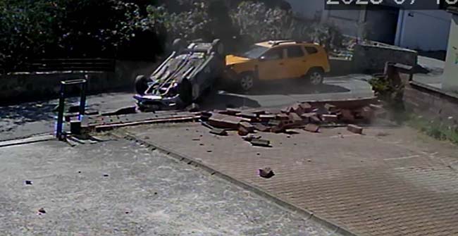 Kaza anı siteye ait güvenlik kamerasına saniye saniye yansıdı. Görüntülerde otomobilin ticari taksi ile çarpışması, siteye ait duvara çarpıp yıkması ve sonrasında takla attığı anlar yansıdı.