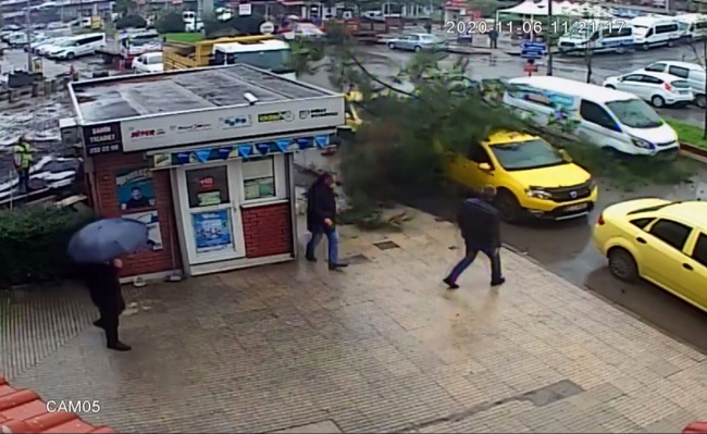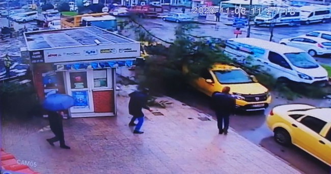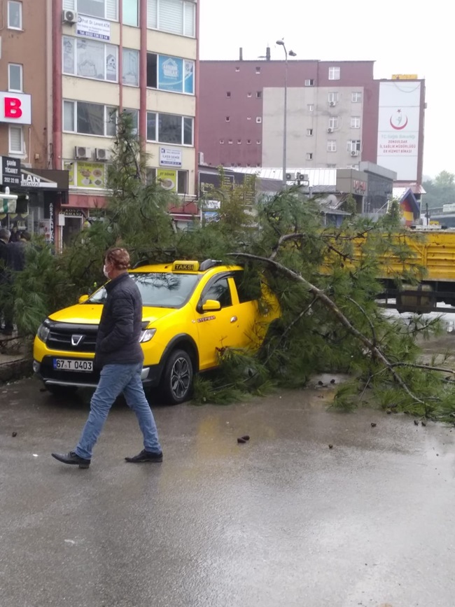 Zonguldak'ta yol çalışmasının yapıldığı sırada çam ağacı; durakta bekleyen ticari taksinin üzerine devrildi. Araçta maddi hasar meydana geldi. Olay yerinde bulunan vatandaşlar ise kaçışarak yaralanmaktan son anda kurtuldu. O anlar ise saniye saniye bir iş yerinin güvenlik kamerasına yansıdı.
