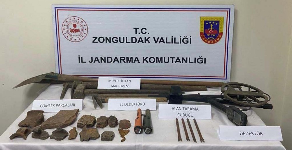 “Zonguldak İl Jandarma Komutanlığınca yapılan çalışmalar sonucunda, 18 Temmuz 2022 günü Kdz.Ereğli ilçesi Yukarıhocalar Köyü mülki sınırları içerisinde yapılan operasyon neticesinde, (2) şahsın ormanlık alan içerisinde kaçak kazı yapıkları sırada, (20) parça tarihi eser bulgu, (1) adet metal arama dedektörü, (1) adet alan tarama dedektörü, (2) adet el dedektörü, (7) adet muhtelif kazı malzemesi ile birlikte suçüstü yakalanmışlardır.