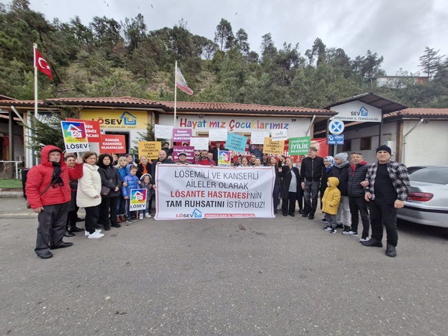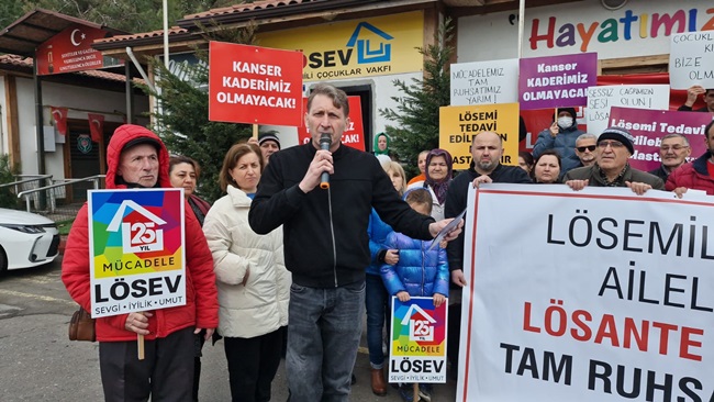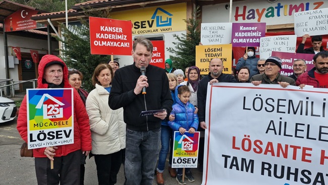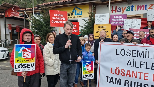 ‘’LÖSEV aileleri olarak soruyoruz. Halkın bağışlarıyla varlığını sürdüren 7 milyon gönüllüsüyle Türkiye’deki en güvenilir sivil toplum kuruluşu olan Lösev’e istismarcı yakıştırması yapmak hangi vicdana sığar? Bu sadece Lösev’e ve kanser tedavisi gören evlatlarımızın anne ve babaları olarak bizleri değil Lösev’e inanan ve güvenen binlerce gönüllü ve bağışçısını da üzmüştür. Sağlık bakanlığının mevzuatında da açıkça belirtildiği üzere LÖSEV’i ve kanser multidisipliner bir hastalıktır. Yani her branş’tan, her daldan uzman doktorun ortak tedavisi şarttır. Biz LÖSEV’i ve kanser ile mücadele eden aileler olarak yine soruyoruz ve tam da ruhsatımızı alana kadar da sormaya devam edeceğiz. Sağlık bakanlığı İstanbul’da ve Ankara’da kendine ait tüm özel hastanelerine ruhsat almıştır. Özel hastaneler açıldığı gibi inşaatlara başlanılmıştır ama Lösente’ye yatak yok Lösente’ye doktor yok kendi özel hastanelerine binlerce yatak ve doktor kadrosunu nerden bulduğunu merak ediyoruz. Mucizeler yaratarak tek kuruş almadan %94 tedavi başarısına ulaşmış ve lösemi ve kanser tedavisi gören çocuk hastalarına her şey dahil tamamen parasız hizmet sunan hayat veren ve bütün dünya tarafından takdir edilen Lösev’e ve Lösev’in 400 yataklı hastanesine neden 7 yıldır tam ruhsat verilmemektedir. Sağlık bakanı sadece kendi hastanelerini değil herkesi eşit düşünmelidir. LÖSEV aileleri olarak bugüne kadar sabırla bekledik bizim yüreğimiz yanıyor çocuklarımız ölüyor bu çocuklar sizin de çocuklarınız olabilir Türk halkının bağışlarıyla tuğla tuğla inşa edilen Lösante hastanemize artık engel olmayın tüm çocuklarımız iyileşsin çocuklarımız Lösev kanserden ölmesin Lösante bizimdir hepimizin hastanesidir. Lösantemize tam ruhsat verilene kadar sahip çıkacağız susmayacağız ve emin olun asla da pes etmeyeceğiz’’dedi.