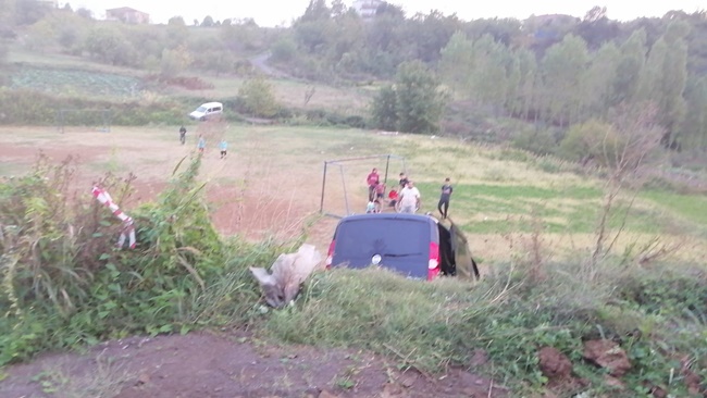 Zonguldak’ın Ereğli ilçesine bağlı Elmatepe Mahallesi'nde sürücüsünün kontrolünden çıkan hafif ticari araç tarlaya uçtu. Kazada şans eseri yaralanan olmazken araçta maddi hasar oluştu.