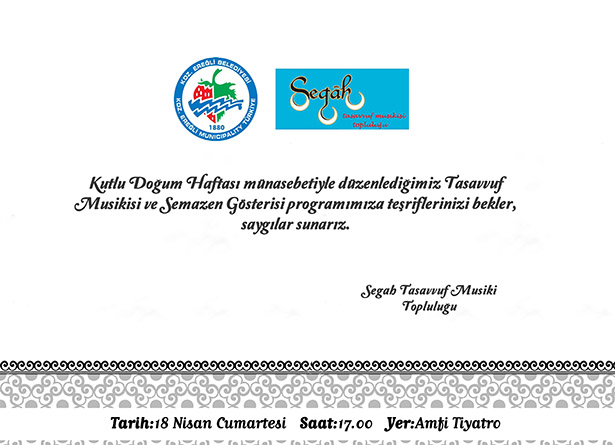 Kdz.Ereğli Belediyesi Basın Bürosu'ndan yapılan yazılı açıklamada, hafta başı başlayan Kutlu Doğum Haftası etkinlikleri kapsamında; 18 Nisan Cumartesi günü akşam saat 17.00'de Amfi Tiyatro'da Kdz.Ereğli Belediyesi ve Segah Tasavvuf Musikisi Topluluğu işbirliği ile Tasavvuf Müziği ve Semazen Gösterisi yapılacağı bildirildi.