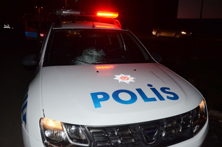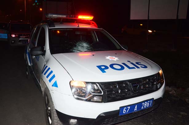 eline aldığı taşlarla polis otosunun camını taşladı.