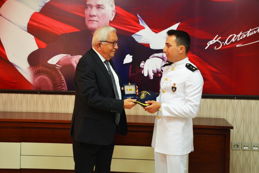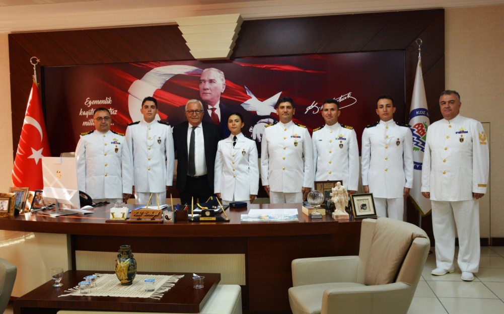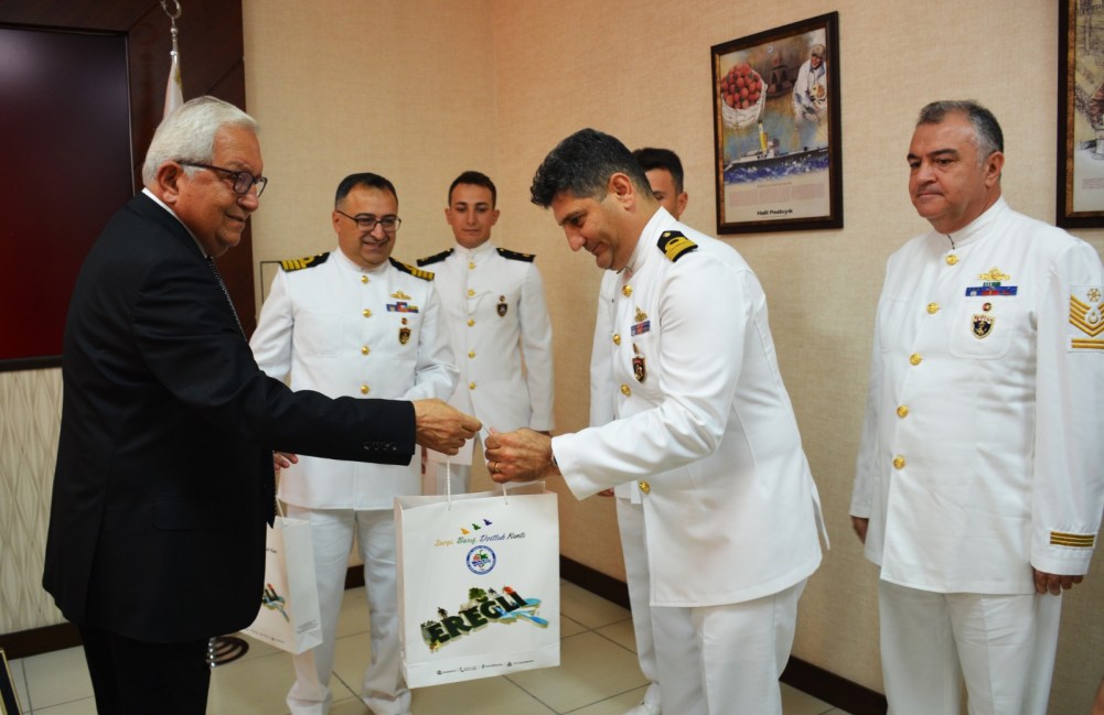 Zonguldak’ın Ereğli İlçe Belediye Başkanı Halil Posbıyık’ı, 2019 yılı Deniz Harp Okulu İleri Deniz Eğitimi (İDE) kapsamında liman ziyaretinde bulunan TCG Sancaktar gemi heyeti ziyaret etti.