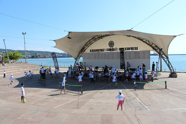 Karadeniz Ereğli Amfi Tiyatro'da düzenlenen etkinliğe katılan 7-12 yaş arası çocuklar, hayatlarında ilk kez tenis oynamanın mutluluğunu yaşadı.
