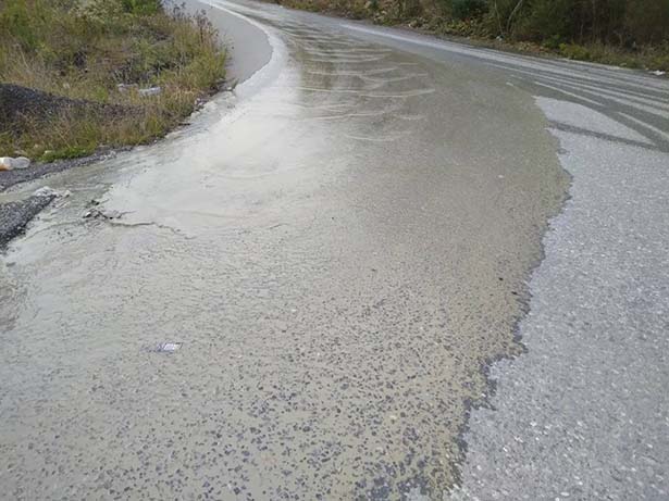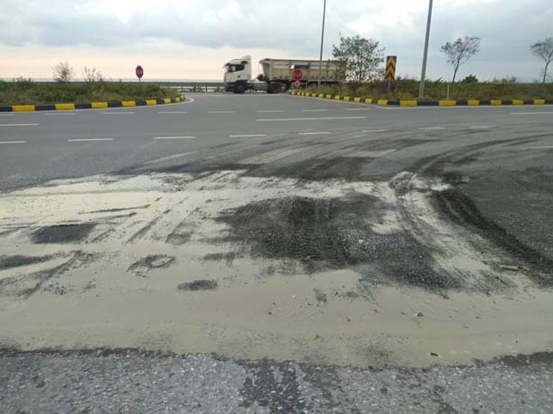 mesafede dökülen mikserdeki sulu beton harçları sürücülere zor anlar yaşatıyor. Alaplı- Akçakoca sınırlarında bulunan önceden
