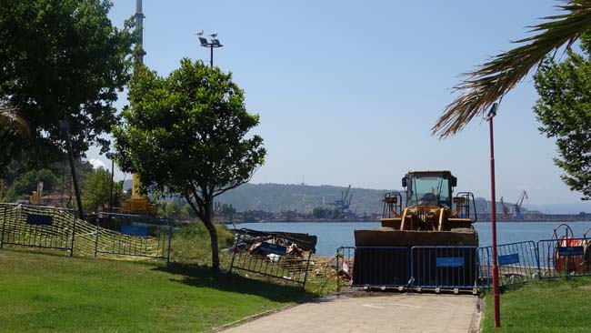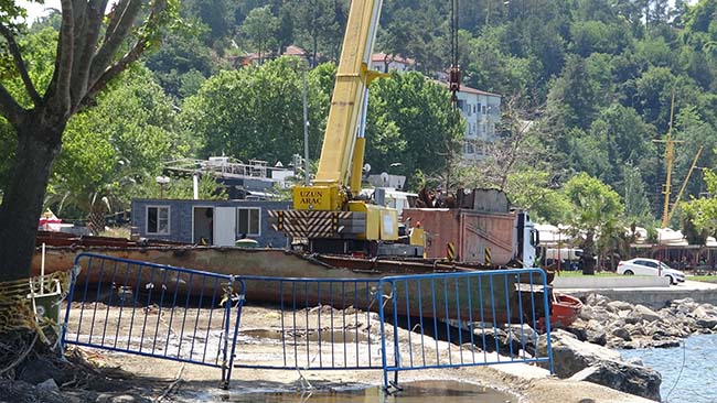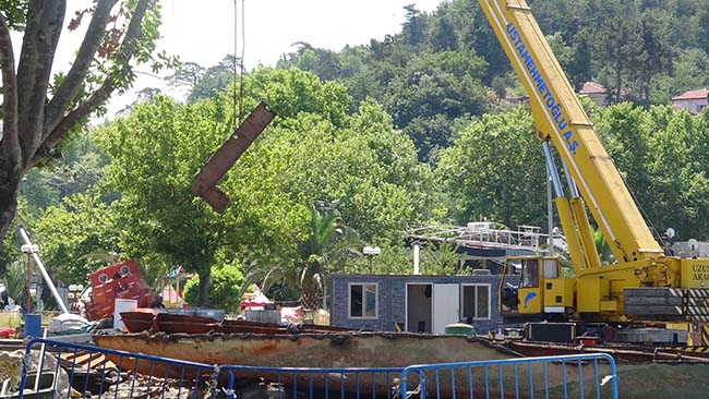 Pallada isimli geminin pruva kısmının da söküm işlemleri ise sürüyor. Karaya çıkartılan kısmı; bölümler halinde parçalanarak kamyonlara yükleniyor.