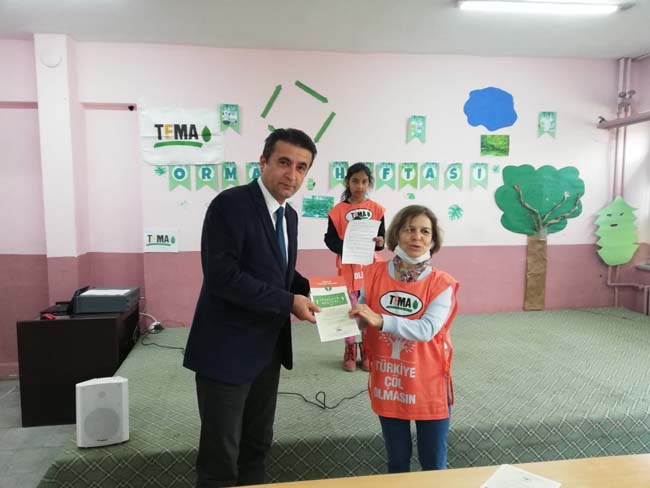 Zonguldak’ın Çaycuma ilçesinde bulunan Şehit Hasan Yağlı İlkokulu üçüncü sınıf öğrencileri yaptıkları etkinlikle TEMA gönüllüsü rozet ve üyelik kartlarını Çaycuma İlçe TEMA temsilcisi Seçkin Ünsal’ın elinden aldı.