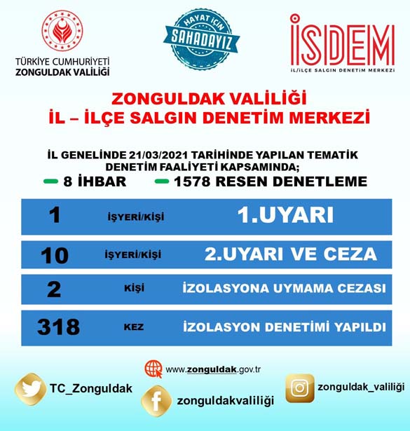 Edinilen bilgiye göre Zonguldak Valiliği İl-İlçe Salgın Denetim Merkezi haftalık korona virüs denetimlerini aralıksız sürdürüyor. Ekipler, bin 578 resen denetim, 8 ihbar ve 318 izolasyon denetimi gerçekleştirildi. Denetimlerde il genelinde 1 kişiye ilk uyarı, 10 kişiye ikinci uyarı ve para cezası 2 kişiye ise izolasyona uymama cezası uygulandı.