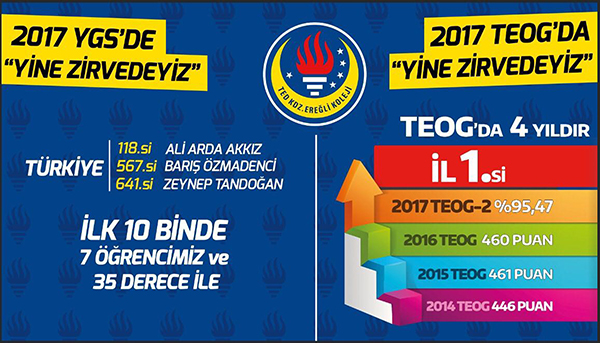 "TED Kdz. Ereğli Koleji öğrencileri YGS'de de adını zirveye yazdırmayı başarmıştır. 2017 YGS'de: TED Kdz. Ereğli Koleji, ilk 1000'e 3 öğrencisini, ilk 10.000'e 7 öğrencisini, ilk 20.000 'e 13 öğrencisini yerleştirme başarısını göstermiştir. Elde ettiğimiz bu başarılarda uygulanan sistemin öğretmen kadrosu kalitesinin ve veli desteğinin etkili oldu. TEOG ve YGS başarısından dolayı tüm öğrenci, veli, öğretmen ve yöneticilerini kutluyorum. Bundan sonra da hem akademik hem sosyal süreçlerde İL'in gururu olmaya devam edeceğiz."