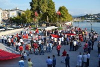 Meydana Türk Bayrakları asan grup, Saygı duruşunda bulunarak İstiklal Marşı