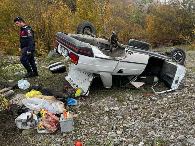 Zonguldak'ta alışverişten dönen çift takla atan otomobillerinden yaralı olarak kurtarıldı. Kazada alışveriş poşetleri etrafa saçıldı.