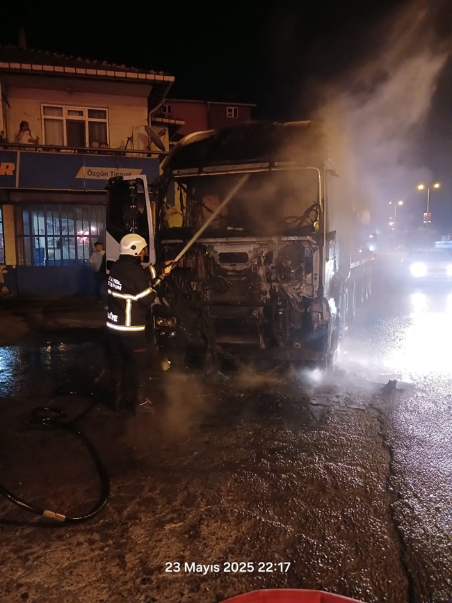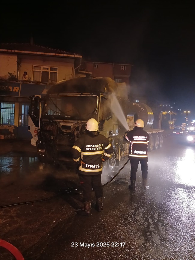 Karadeniz Ereğli ilçesinde seyir halindeki TIR alevlere teslim oldu. Sürücüsünün son anda kurtulduğu olayda itfaiye, Polis ve sağlık ekiplerine haber verildi.