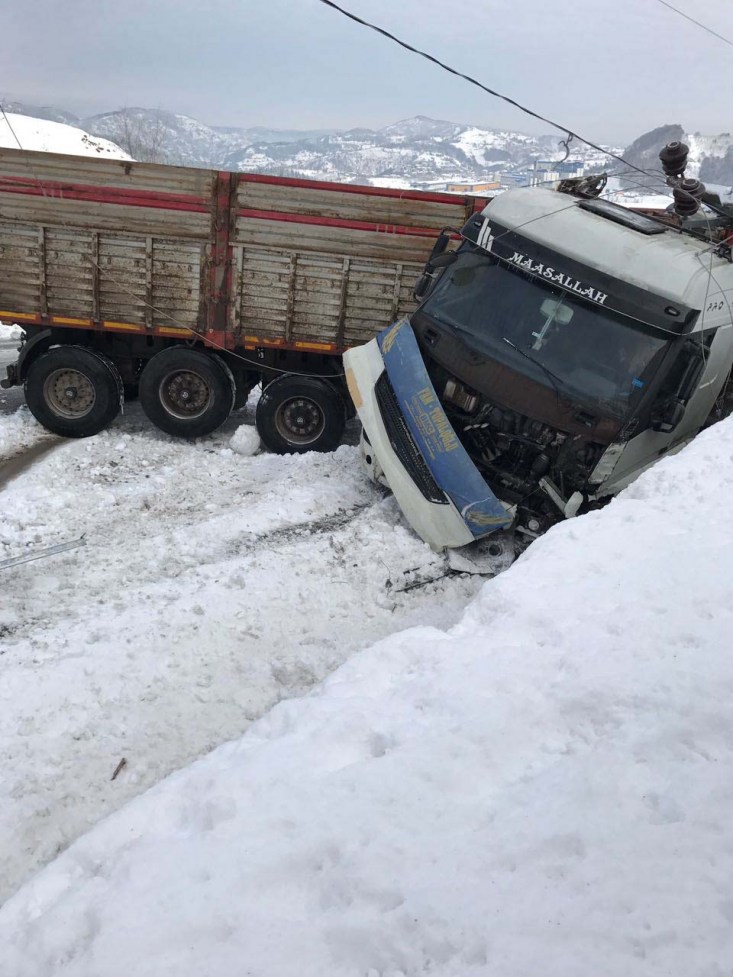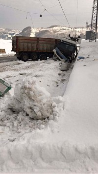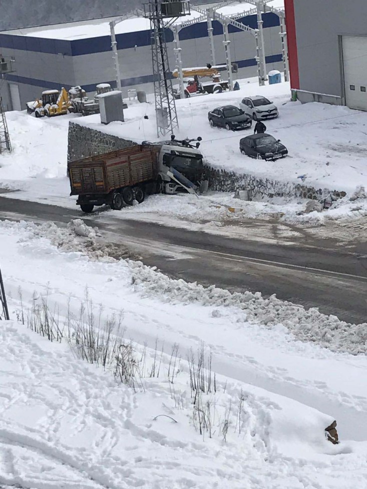 Zonguldak in Ereğli ilçesinde buzlanan yolda sürücüsünün direksiyon hakimiyetini kaybettiği TIR su kanalına düştü.