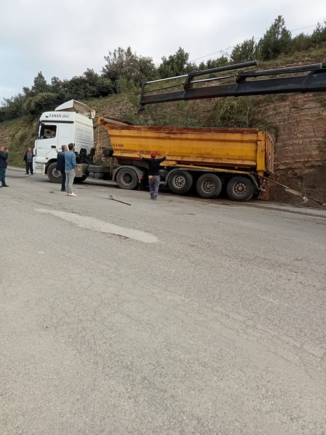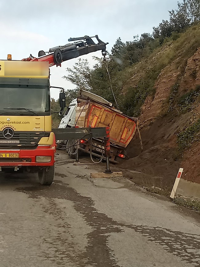Karadeniz Ereğli ilçesi Organize Sanayi yolu üzerinde kayan TIR su kanalına düştü.