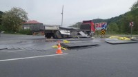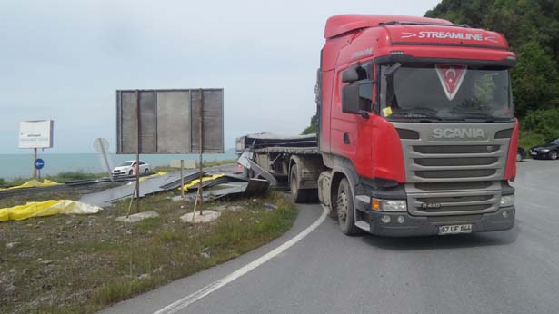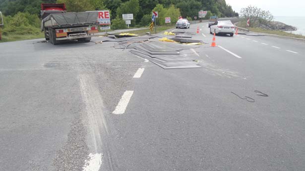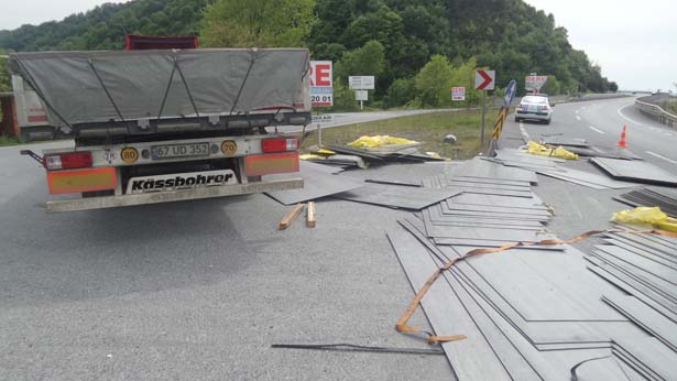 Zonguldak'ın Alaplı İlçesinde, seyir halindeki TIR'ın dorsesinden kayan saclar, karayoluna saçıldı.