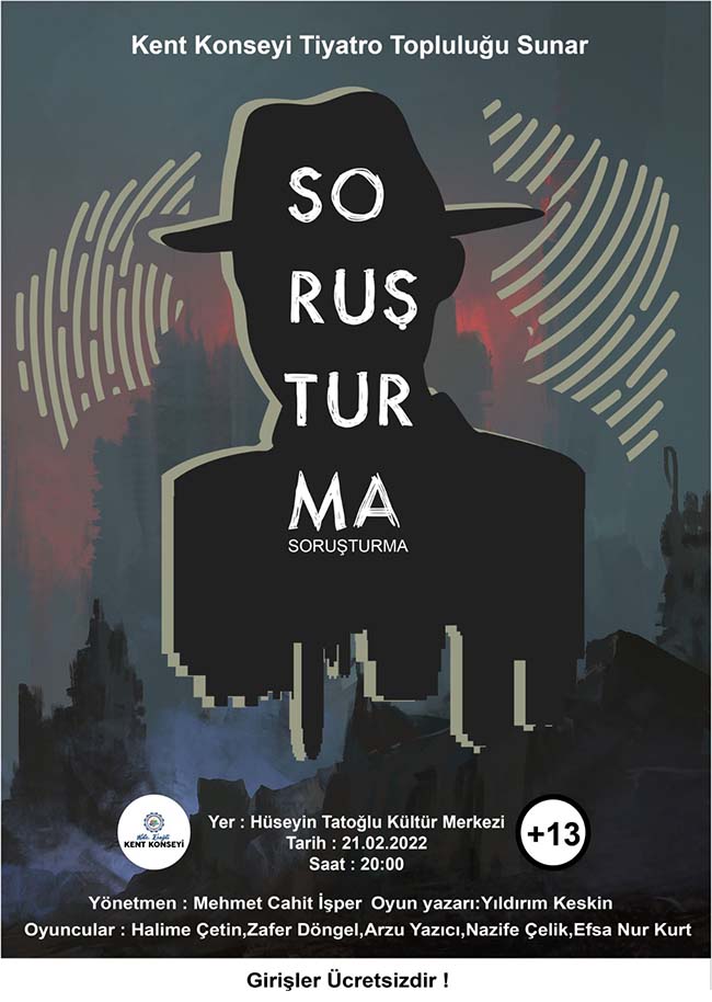 Kdz. Ereğli Kent Konseyi Tiyatro Topluluğunun hazırladığı ve Mehmet Cahit İşper’in yönettiği “Soruşturma” adlı oyun 21 Şubat Pazartesi akşamı saat 20.00’de Tatoğlu Kültür Merkezi’nde sahnelenecek.