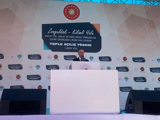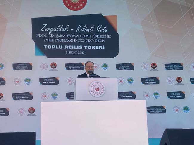 Ardından kürsüye çıkan Zonguldak Valisi Mustafa Tutulmaz, "Zonguldak-Kilimli yolu ve Teoman Duralı tünelleri, Zonguldak-Kilimli arasını 30 dakikadan 5 dakikaya, 11 kilometrelik yolu da 6 kilometreye düşürecek yolun hayırlı olmasını dileyerek “Bugün Zonguldak olarak ilimiz, ülkemiz açısından önemli yatırımları hizmete açarak aziz milletimizin hizmetine sunmanın büyük bir sevinç, heyecan ve mutluluğunu yaşıyoruz. Bu anlamlı günde aramızda bulunarak sevincimizi paylaşmanızdan dolayı sizlere teşekkür eder. İlimize hoş geldiniz diyor saygılarımla selamlıyorum. 2002 yılından buyana ilimiz önemli yatırımlar almış, almaya devam etmektedir. Bu gün Ulaştırma, Enerji, Çevre, Şehircilik, Eğitim, Sağlık, Sanayi, Teknoloji, Tarım, Orman, Yerel Yönetimler ve sosyal hizmetler alanında son 3 yılda tamamlanan 3 milyar değerinde 84 farklı ve önemli projenin resmi açılışını yaparak vatandaşlarımızın hizmetine sunuyoruz. Cumhurbaşkanımızın emir ve talimatlarıyla, sizin de büyük emeği bulunan Filyos Vadisi Projesi'nde yer alan ve tamamlanarak 4 Haziran tarihinde Cumhurbaşkanımızın ilimizi teşrifleriyle hizmete açılan Filyos Limanı ile çalışmaları halihazırda devam eden endüstri ve serbest bölgeler de oluşturacağı yatırım, üretim, istihdam ve ihracatla geleceğe umut vermektedir. Cumhurbaşkanımızın verdiği müjdeyle Zonguldak açıklarında Fatih Sondaj Gemisi'nin bulduğu Filyos'ta karaya çıkacak olan doğalgazla ilimizi yeni enerji üssü ve orta, yüksek teknoloji sektöründe kümelenme merkezi yapacaktır. Alt yapı çalışmalarının süratle devam ettiği Sakarya Gaz Sahası'ndan gelecek olan gazın depolanacağı tesisin çalışmaları devam etmektedir. Bugün açılışı yapılacak olan Zonguldak-Kilimli yolu ve Teoman Duralı tünelleri, Zonguldak-Kilimli arasını 30 dakikadan 5 dakikaya, 11 kilometrelik yolu da 6 kilometreye düşürecek. Trafik akışını da çok rahatlatacaktır. Cumhurbaşkanımızın talimatları doğrultusunda ihalesi yapılan Kilimli-Filyos-Saltukova yolunun tamamlanmasıyla Filyos bölgesinden il merkezinin faydalanması sağlanacaktır. Açılışı gerçekleştirilecek tesislerin hayırlı olmasını diliyorum” dedi.