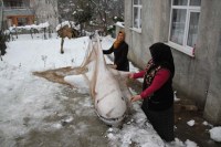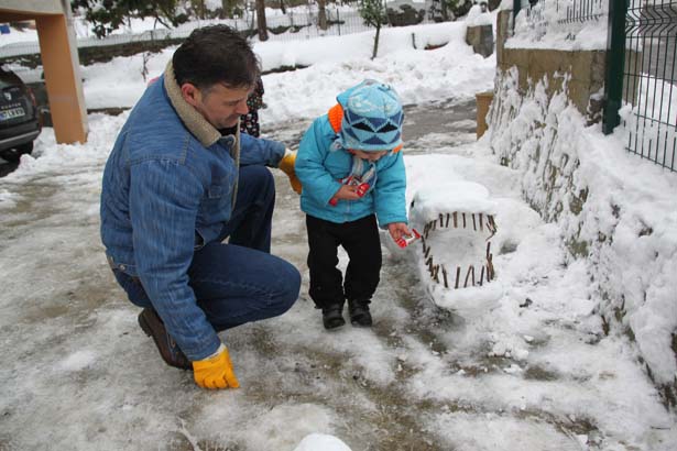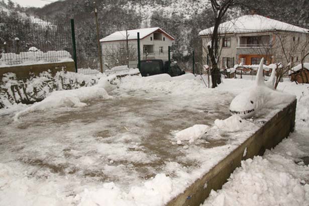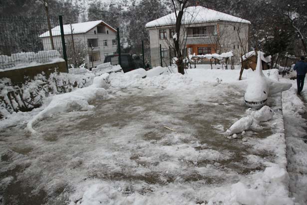Ereğli Demir ve Çelik Fabrikaları'ndan emekli olan Erol Uzuner (50), evlerinin önünde yüksekliği yaklaşık 80 santimetreyi bulan kardan çeşitli hayvan figürleri yaptı.