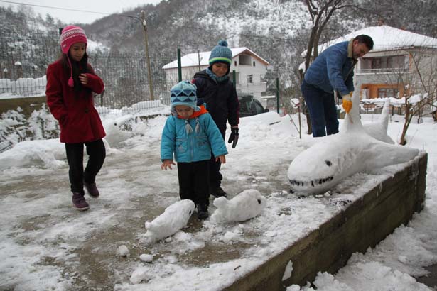 Zonguldak'ın Ereğli ilçesinde, olumsuz hava koşulları yaşam koşullarını zorlaştırırken, bazı vatandaşlar günlerini keyifli hale çevirmek için kardan timsah, köpek balığı ve küçük balık yaptı.