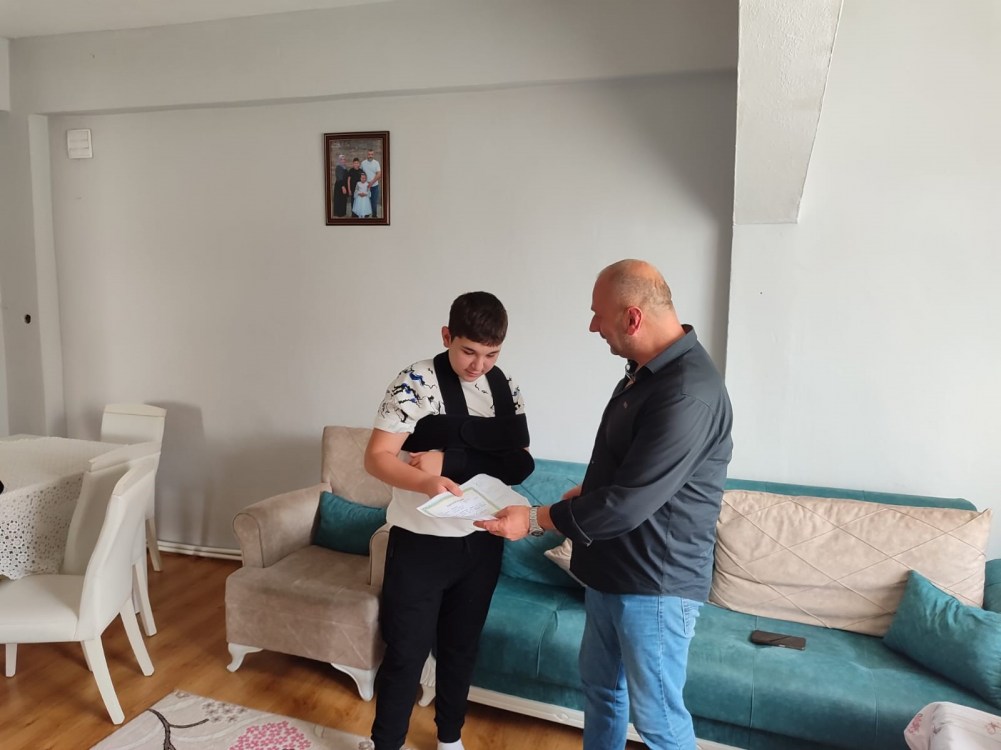 Zonguldak'ta trafik kazasında yaralanan 14 yaşındaki öğrencinin karnesini okul müdürü ve öğretmenleri; arkadaşlarıyla birlikte evine giderek verdiler.