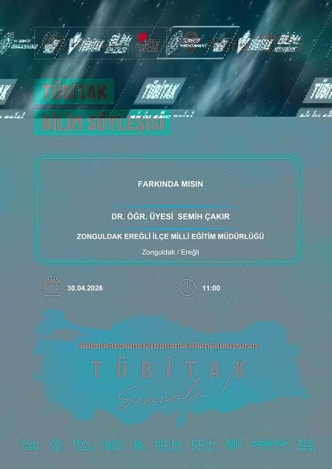 Alınan bilgiye göre, bu kapsamda; “Farkında Mısın?” başlıklı siber güvenlik temalı bilim söyleşisi 30 Nisan 2026 tarihinde saat 11.00’de Tatoğlu Kültür Merkezi’nde yapılacak. Ortaokul öğrencilerine yönelik olarak planlanan söyleşi programı, ilçedeki farklı okullardan öğrencilerin katılımıyla gerçekleştirilecek.