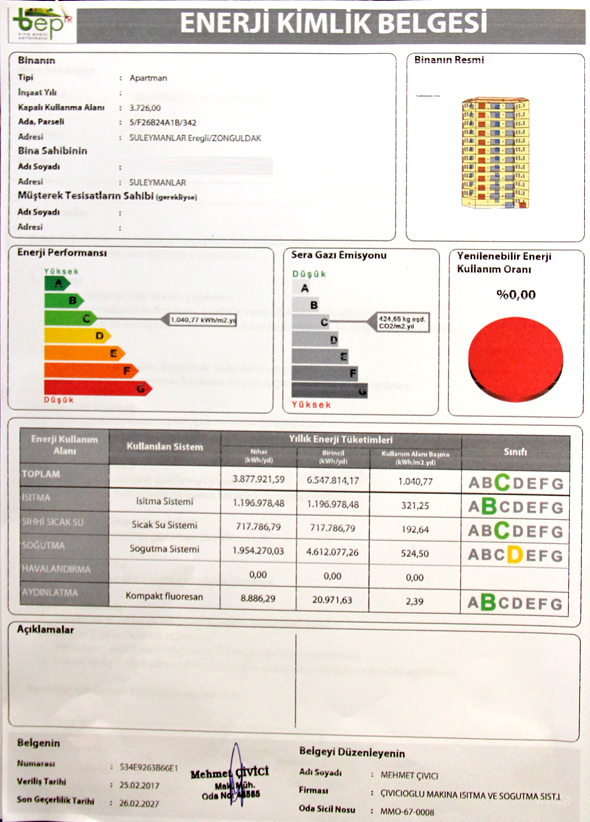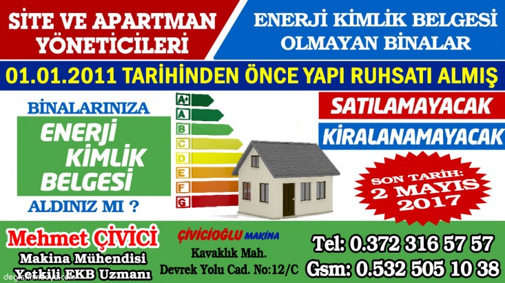 Enerji Bakanlığı'nın enerji tasarrufu sağlamayı hedeflediği Enerji Kimlik Belgesi zorunluğu belgelerinin tüm binalar için 2 Mayıs 2017 tarihine kadar alınması gerekiyor. Enerji Kimlik Belgesi olmayan binalarda satış, satın alma ve kiralama işlemleri yapılamayacak. Kdz. Ereğli ve bölgesinde Enerji Bakanlığı'nın onayı ile Enerji Kimlik Belgesi'ni ise Makine Mühendisi Mehmet Çivici verebilecek.