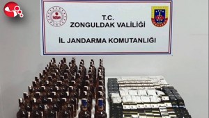 Zonguldak’ın Çaycuma ilçesinde İl Jandarma Komutanlığı ekiplerince yapılan aramada sahte alkol ve makaron ele geçirildiği duyuruldu.